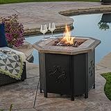With its slate tile and steel mantel, this handcrafted Endless Summer LP fire pit, by Blue Rhino, features the classic elements of high end furniture, with the durability of weather resistant steel. Its decorative base cleverly conceals a propane tank (not included) and control panel, making it an attractive centerpiece for your outdoor living space. Complete with a 30,000 BTU stainless steel burner, you can enjoy all the ambiance of a classic fire, without the mess of tending ashes. Adding to the elegance, this unit includes lava rock, which beautifully accents its flames. The unit is easy to assemble with no tools needed, and includes a 1-year limited warranty and protective cover.