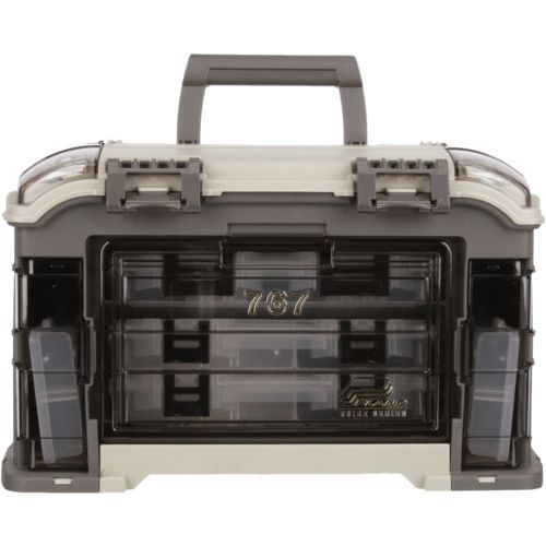 The Plano® 767 Guide Series Angled Tackle System includes 5 utility boxes and a main compartment that presents the boxes at a 15° angle. Available at Academy Sports + Outdoors.