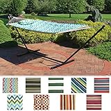 DESIGN SPECIFICATIONS -Vibrant stripe pattern – Hammock made of heavy duty cotton fabric that is dye-treated for UV resistance – Machine Washable -Solid wood Spreader bar – Accommodates 2 people – 450 pounds weight capacity – Package Includes: steel frame, hammock bed, hardware, and instructions – Fits hammocks ranging from 9.8 ft to 12 ft – Hammock bed measures approximately 75″ X 55″ – Frame Measures approximately 147″ X 47 ” X 47″